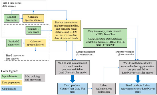 To further expand the predictor information to aid in delineating different LULC classes, we incorporated topographic, bio-climatic, night-time light, and additional spatial environmental data in our classification frameworks (Table 2). For night-time light, which is an important variable in identifying human settlements, we used the Visible Infrared Imaging Radiometer Suite (VIIRS) [43]. For bio-climatic variables, we leveraged both the WorldClim normal 30-year climate normal dataset [44] and TerraClim monthly temperature/precipitation statistics [45]. Additional data sources included the Continuous Heat-Insolation Load Index (CHILI Index) [46] derived from 90 m elevation data from the Shuttle Radar Topography Mission, iSDA soil texture class [47], and a map of World Ecoregions (RESOLVE) [48]. Among these additional datasets, VIIRS and TerraClimate features were calculated for each year, while WorldClim, CHILI Index, iSAD soil texture, and Ecoregion classes were static (e.g., not changing over years; Table 2). As we leveraged data sources that represent a wide range of spatial resolutions, we resampled all input data to a common 30 m resolution for Tier 1, and 10 m for Tier 2, for data extraction.