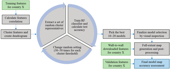 Overall, 154 features for Tier 1 maps and 170 features for Tier 2 maps were calculated, but reduced to a limited set of less-correlated features (between 28 and 53 features) for the final models. To conduct feature selections, we filtered correlated features to reduce the complexity of each model. Correlated features are believed to have little impact on the performance of RF classifiers, but they do impact feature ranking [55]. For each country and product tier, we first calculated the correlation matrix for the training data and created a dendrogram (hierarchical clustering model) of feature correlations (Figure 3). Through an iterative process, we selected different thresholds to cut the dendrogram to generate a set of randomly selected features from each cluster, trained an RF model, and calculated model performance (Figure 3). A final set of 10–20 top-performing models were selected for further visual refining. This extra refining step was needed as we found that models with comparable model assessment results can still produce significantly different map products when applied spatially. We visually compared the model outputs within several heterogeneous test areas for the final model selection for each product tier and study country.