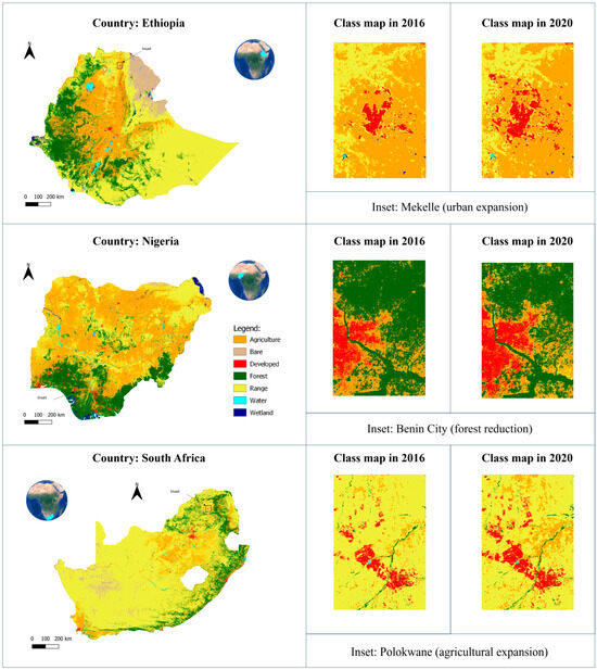 Land use maps for Ethiopia, Nigeria, and South Africa in 2020. For each country, we display an inset area of the land use maps for the initial and final years of our study period (2016 and 2020) to show examples of land use change surrounding areas of urban expansion.