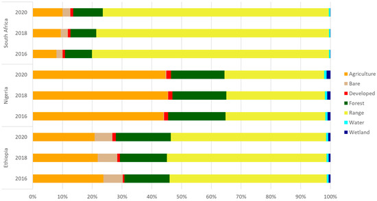Composition of land use classes in Ethiopia, Nigeria, and South Africa at the 2016, 2018, and 2020 timesteps.