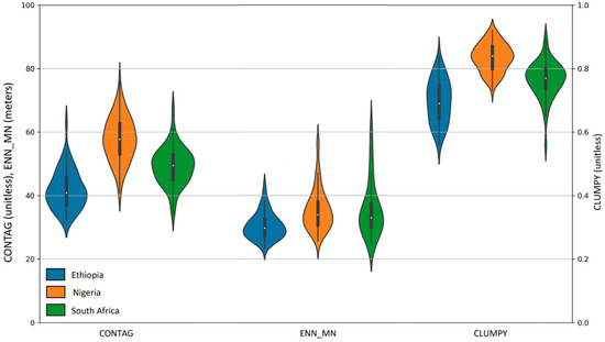 However, we found a relatively higher range and mean for CONTAG values across Nigerian cities in both 2016 and 2020, suggesting that the LC types in Nigerian cities tended to be more aggregated and less proportionally distributed compared to the other two countries. While average CONTAG values for Nigeria were the same for 2016 and 2020, the range was shrinking, which may indicate that some Nigerian cities have greater land cover intermixing (lower CONTAG). This is consistent with Nigeria’s higher CLUMP values for the building class compared to Ethiopia and South Africa. For Ethiopia, the maximum CONTAG, CLUMP, and ENN_MN values were lower than for the other two countries, exposing less dense and more interspersed LC configurations.