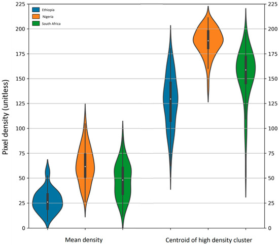 In addition to landscape metrics, we calculated building density statistics over each city and the centroid value of each density bin for the study countries. Our results for the year 2020 were comparable to those of 2016, with the distribution of high-density bin centroid value for the year 2020 depicted in Figure 8. Ethiopian cities show both lower overall mean density and lower prevalence of high-density neighborhoods (as shown by the centroid of the high-density bins) compared to South Africa and Nigeria, while the Nigerian cities exhibit the highest densities. This result aligns with the CLUMP results (Figure 7).