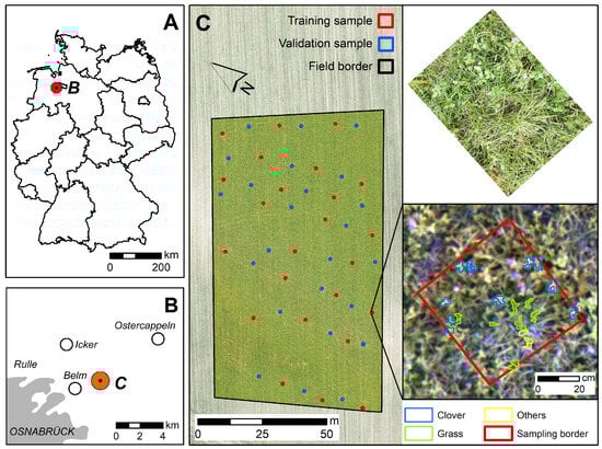 Nahrstedt, K.; Reuter, T.; Trautz, D.; Waske, B.; Jarmer, T. Classifying Stand Compositions in Clover Grass Based on High-Resolution Multispectral UAV Images. Remote Sens. 2024, 16, 2684. https://doi.org/10.3390/rs16142684