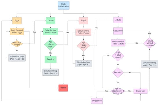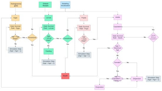 In the first scenario, we simulated the dispersal of D. saccharalis without biological control. This scenario involved modeling the complete life cycle of D. saccharalis, including its four biological forms. The flowchart of the first scenario is presented in Figure 4.