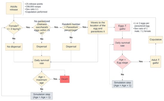 The biological control of D. saccharalis using T. galloi and C. flavipes was based on the work of []. According to [], the most effective biological control method involves three releases of T. galloi followed by one release of C. flavipes. We simulated the same biological control method, which included three releases of 200,000 adults of T. galloi distributed across 25 points, followed by the release of 6000 adults of C. flavipes distributed across 8 points of the simulation environment. Figure 5 presents the flowchart of the second scenario simulation.