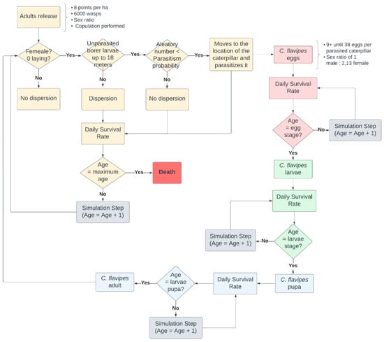 At simulation step 46, 6000 C. flavipes adults were released. C. flavipes originates from Asia [] and experiences several stages of development: egg, larva, pupa, and adult. It can only complete its life cycle when associated with D. saccharalis caterpillars. Parasitism occurs through female wasp stings when many eggs are deposited inside the D. saccharalis caterpillar. The deposited eggs hatch, producing larvae that feed inside the caterpillar. Eventually, the larvae migrate out of the caterpillar’s body, causing its death. Subsequently, they enter the pupal stage, and within a few days, the adults emerge []. The flowchart of C. flavipes agents implemented in the model is presented in Figure 7.