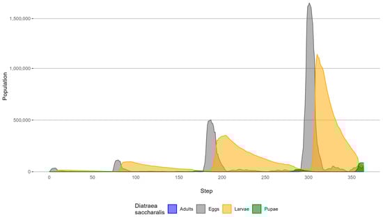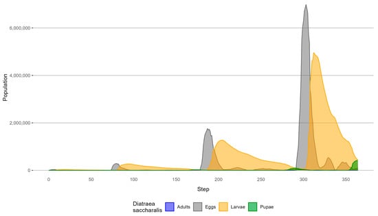 Figure 8 illustrates the simulated population of D. saccharalis by biological form for each simulation step.