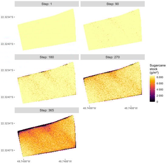 The two least abundant biological forms are adults and pupae. Peaks in the adult population occur at steps 75 (1832 adults), 181 (11,742 adults), and 296 (47,299 adults), while peaks in the pupal population are observed at steps 176 (24,719 pupae), 291 (93,864 pupae), and 364 (416,683 pupae). The simulated dispersal of D. saccharalis and its impact on the crop field are shown in Figure 9. The simulation started with all cells in the simulation environment containing 8500 g of sugarcane (Step 1).