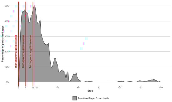 The reduction in the population of D. saccharalis is a direct result of T. galloi and C. flavipes parasites used for biological control. Regarding the T. galloi parasite, the highest percentages of parasitized eggs were observed at steps 18 (50%), and 8 (47%), leading to a significant reduction in the population of D. saccharalis eggs (Figure 11). This result demonstrates a lower parasitism rate compared to the findings reported by [], who observed a 71% egg parasitism after 2 days of releases. Nevertheless, our result is close to the one obtained by [], who achieved a parasitism rate of 51% at a 5 m release distance. It is worth mentioning that [] was the only work found in the literature containing a formulation to simulate the parasitism levels of T. galloi as a function of the release distance to the eggs of D. saccharalis. Despite the release of T. galloi adults at the beginning of the simulation, the cycle persisted, naturally generating new cycles until step 139 (Figure 11).