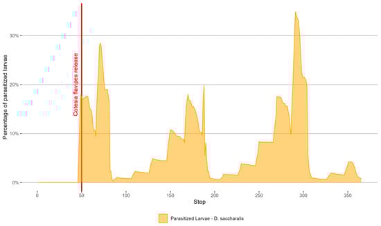 Regarding the parasitism of C. flavipes, the highest parasitism rates occurred at steps 291 (34.8%), 71 (28.4%), 188 (19.8%), and 49 (17.8%) (Figure 12). We observed that the simulated parasitism by C. flavipes was lower than that by T. galloi, with the maximum peak of parasitized larvae at 30.8%, compared to the maximum peak of parasitized eggs at 50%. The parasitism by C. flavipes was similar to that reported by [], who observed a 14.6% parasitism rate after 15 days of release.
