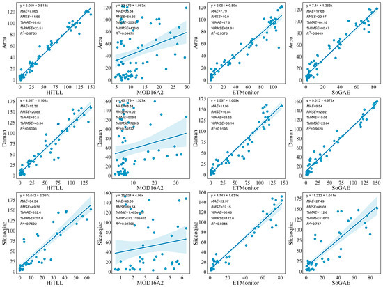 At the site scale, we conducted a linear regression analysis of four RS_ET products—HiTLL, MOD16A2, ETMonitor, and SoGAE—at the site scale in three superstation sites in the upstream, midstream, and downstream in the HRB.