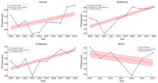 At the regional scale, although MOD16A2 and ETMonitor have similar explanatory power, the ability of the MOD16A2 product to accurately reflect the trend changes at the whole basin scale is compromised due to the relatively large data gaps in the middle and lower reaches of the HRB. ETMonitor also shows a significant positive correlation trend, although slightly lower than MOD16A2, which is sufficient to demonstrate its ability to capture the long-time series changes in the HRB. In contrast, the trend line values of HiTLL and SoGAE are lower, indicating that they may have limitations in trend capturing, especially under more complex or variable underlying surface conditions.