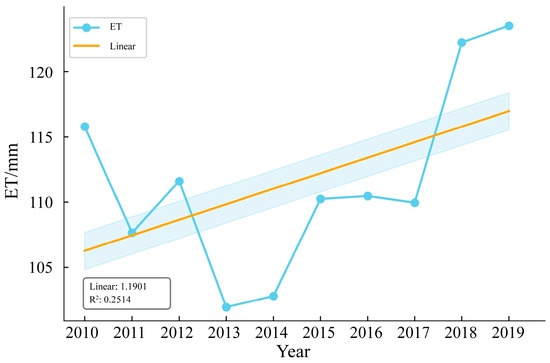 From 2010 to 2019, the annual average ET in the HRB, as shown in Figure 5, shows that, over the past 20 years, the overall trend of increasing ET in the entire basin is fluctuating. The ET in the HRB showed an increasing trend year by year from 2010 to 2019. The slope of the linear trend line is approximately 1.1901, indicating an average annual increase of 1.1901 mm in ET. The yearly changes in ET in the HRB are as follows: 2011 decreased by 8.14 mm compared to 2010; 2012 increased by 3.96 mm compared to 2011; 2013 decreased by 9.66 mm compared to 2012; 2014 increased by 0.84 mm compared to 2013; 2015 increased by 7.45 mm compared to 2014; 2016 increased by 0.22 mm compared to 2015; 2017 decreased by 0.50 mm compared to 2016; 2018 increased by 12.28 mm compared to 2017; 2019 increased by 1.27 mm compared to 2018.
