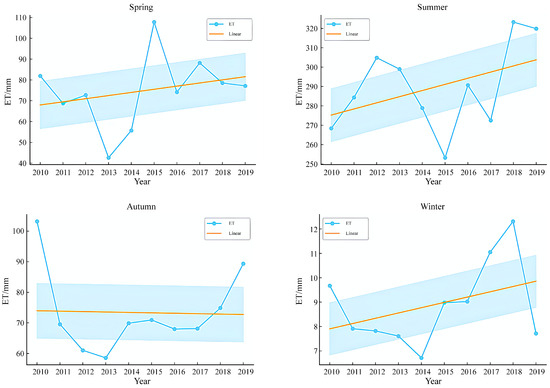 Spring and autumn ET values are in the medium range, with relatively less variability. However, spring shows slightly more variability than autumn, possibly influenced by spring precipitation and the activity of vegetation growth. The trend line shows that, despite obvious seasonal fluctuations, the long-term trend indicates that the ET in summer and winter is increasing, while spring shows a slight downward trend and autumn remains relatively stable. These seasonal changes are likely related to long-term climate patterns, changes in land use, and regional water management policies.