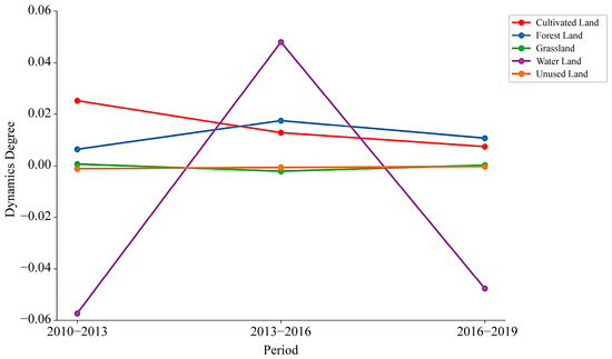 As shown in Figure 9 and Table 3, we calculated the single dynamic degree for each type of land use in the HRB and the comprehensive dynamic degree for the entire basin. We identified the complexity of land use changes within the HRB and their temporal characteristics.