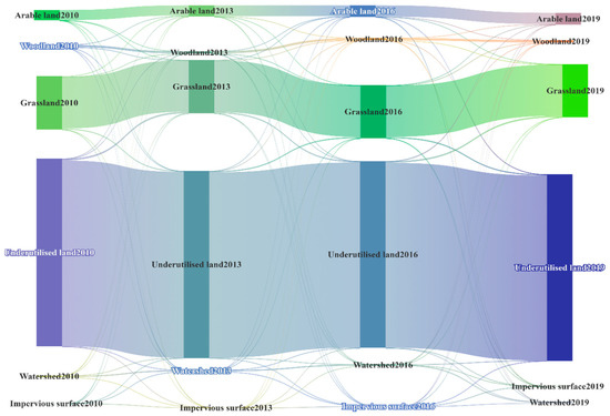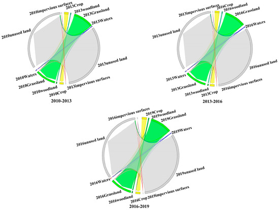 The dynamic changes in land use data of the study area in different years are shown in Figure 10 and Figure 11. Between 2010 and 2013, we observed significant land cover changes mainly characterized by a slight decrease in cropland, which decreased by approximately 56,975 ha, primarily converting to grassland (10,469 ha) and forest land (35 ha); concurrently, the areas of forest and grassland showed an increasing trend, with forest land increasing by 12,126 ha and grassland increasing by 28,947 ha. The area of water bodies also decreased during this period, decreasing by approximately 6427 ha, mainly converting to other categories such as cropland (532 ha) and unused land (19,334 ha). Finally, the area of unused land showed significant growth, increasing by approximately 10,433 ha. From 2013 to 2016, the total area of cropland increased by approximately 61,086 ha, mainly due to the conversion of grassland (24,515 ha) and unused land (12,533 ha) into cropland. The total area of forest land also expanded by approximately 12,441 ha, mainly due to the conversion of cropland (48 ha) into forest land. The total area of grassland steadily increased by approximately 28,962 ha, primarily from converted cropland. The total area of water bodies slightly decreased by approximately 6602 ha, with their areas mainly converting to cropland (331 ha) and unused land (2804 ha). Additionally, the area of unused land continued to expand by approximately 10,411 ha during this period. Between 2016 and 2019, the area of cropland continued to increase by approximately 63,056 ha, mainly due to the trend of converting grassland (31,787 ha) and unused land (7563 ha) into cropland; the area of forest land significantly increased by approximately 13,047 ha, mainly due to the conversion of grassland (5630 ha) into forest land; meanwhile, the area of grassland decreased by approximately 10,362 ha, mainly converting to cropland (31,787 ha) and unused land (68,338 ha); the area of water bodies significantly decreased by approximately 6322 ha, mainly converting to unused land (15,791 ha); nevertheless, the area of unused land still increased by approximately 10,389 ha during this period.