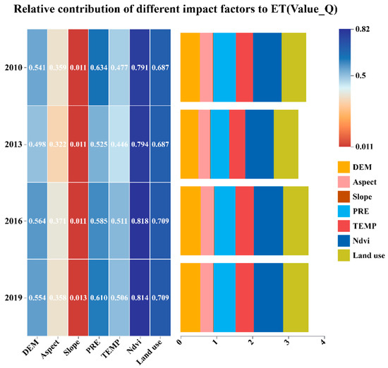 In the analysis of the geographical detector results for ET in the HRB from 2010 to 2019 seen in Figure 14, at the same time, we added a standard scale to indicate the share of different ET impact factors. The vegetation index (NDVI) was consistently the most significant factor affecting ET, with its influence peaking in 2016 with a Q value of 0.818 and remaining above 0.7 in other years. Precipitation (PRE) and temperature (TEMP) were also significant influencing factors, with their relationship to ET showing some variability across different years, with temperature’s influence increasing in 2019 with a Q value of 0.506. Elevation (DEM), although varying slightly each year, maintained a relatively high overall contribution to ET, while the influence of slope was relatively minor, possibly reflecting the relatively stable impact of topography on the hydrological cycle.