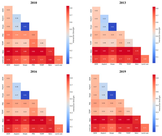 Through the analysis of Figure 15, we observed the dynamic changes in interactive factors for actual ET in the HRB from 2010 to 2019. Throughout this period, the interaction between the vegetation index (NDVI) and topography (DEM) consistently dominated. Specifically, in 2010 the interaction between NDVI and DEM had a Q value of 0.83, and in 2013 it was similarly high at 0.82, indicating that ET during those years was significantly influenced by the interplay of vegetation cover and elevation. By 2016, this interaction’s Q value even rose to 0.85, and the trend continued in 2019, demonstrating a strong synergistic effect between vegetation and topography on ET. Regarding land use, over time, this factor’s contribution to ET has significantly increased, with Q values of 0.83 in 2016 and 0.81 in 2019, reflecting that changes in land cover, especially changes caused by human activities, have an increasingly important impact on regional ET.