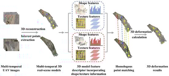The specific workflow of the proposed framework is depicted in Figure 1. Initially, high-resolution UAV images of the landslide area collected at different times were processed through photogrammetry, and the generated multi-temporal 3D models were registered to maintain coordinate consistency [54]. Subsequently, using the proposed method for extracting interest points using voxel-based thinning, a set of interest points uniformly covering the entire geological landslide area was extracted from the previous time phase 3D mesh point cloud. Next, based on the real-scene 3D model feature descriptor that integrates shape/texture information, the 3D homologous point matching of all interest points was conducted in the subsequent time phase 3D mesh point cloud. Finally, the 3D deformation was calculated based on the matched set of homologous points.