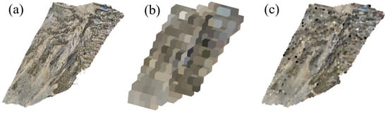 In this experiment, a DJI M300 RTK drone and DJI Zenmuse P1 camera were utilized to capture images over the Lijie north hill landslide area. UAV images of two temporal phases were acquired in March and September 2022, respectively. The parameters for both flights were kept consistent, with a flight altitude of 100 m, a forward overlap of 80%, and a side overlap of 50%. After data collection, the high-resolution images were processed to obtain the real-scene 3D model. It should be noted that in the process of multi-temporal model registration, we first manually selected some points from stable areas (i.e., areas without deformation) based on the results of the first period of aerial triangulation. These points were then used as control points for the aerial triangulation of the second period images by using the method proposed in [54], thereby achieving the registration of the models from the two periods.