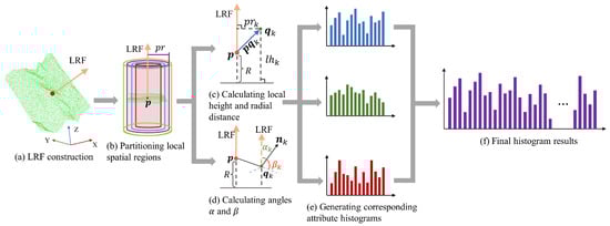 After establishing the LRF, to eliminate the effects of rigid body transformations, the point set is transformed into the LRF centered at point . As shown in Figure 4b, based on the transformed local surface data, the space is first divided into various local subspaces along the radial direction and then compute three geometric attributes within each subspace. Figure 4c displays the schematic diagram of the local height for point , which is calculated as follows: