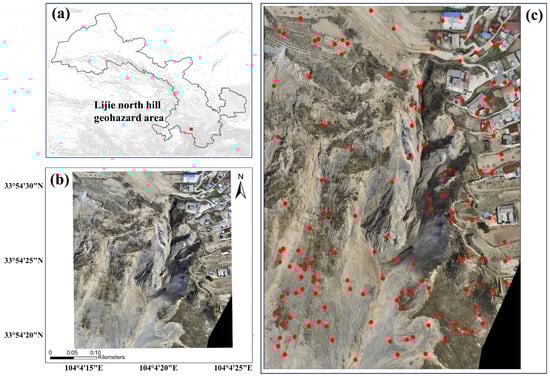 Overview of the study area. (a) Location of the Lijie north hill geohazard area in Gansu province, China. (b) The orthophoto of the test area. (c) Distribution of the manually measured checkpoints.