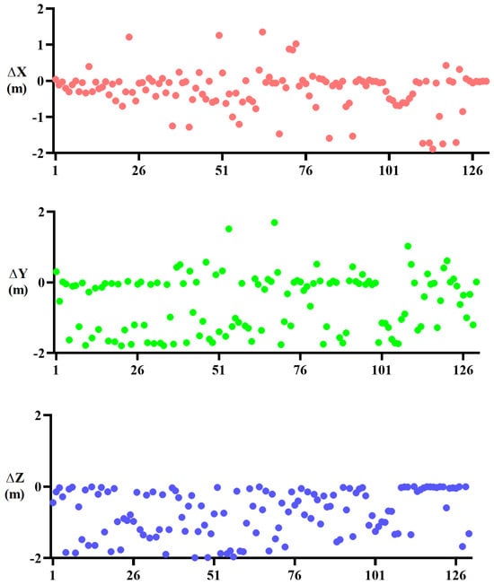 The detailed displacement parameters of the manually measured checkpoints are shown in Figure 6. It can be observed that the displacement range is concentrated within 2 m. Additionally, the displacement variations among different checkpoints differ, thereby enhancing the diversity of the test.