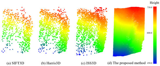 Interest points extracted by the proposed method and baseline methods. The color of interest points changes from blue to red, representing elevation values from low to high.