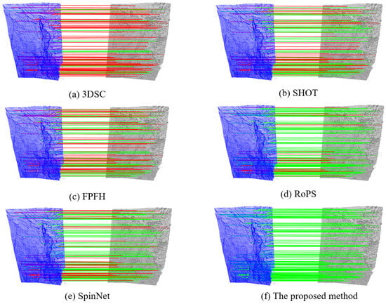 Figure 8 displays the visualization results of 3D homologous point matching in the Lijie north hill test area. In the visualization, green lines represent correctly matched point pairs, while red lines indicate incorrectly matched point pairs. Given the inherent difficulty of 3D homologous point matching, a matched point pair is considered incorrect if the absolute value of the matching error in any of the XYZ directions exceeds 10 cm [53].