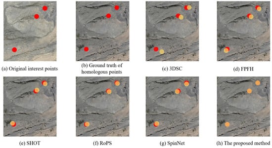 Figure 9 displays the results of point matching in a local area of the Lijie north hill using the proposed method and baseline methods. A higher overlap between the yellow and red points indicates greater accuracy in point matching process. It can be seen that the points matched by the proposed method almost completely coincide with the ground truth points, demonstrating the high accuracy of the proposed method. Similarly, the RoPS method also exhibits relatively high accuracy, while the SpinNet, SHOT, and FPFH methods show a reduced overlap between the matched points and the ground truth points, indicating lower matching accuracy compared to the proposed and RoPS methods. The homologous points matched by the 3DSC method are at a greater distance from the ground truth points, indicating poorer accuracy in point matching process.