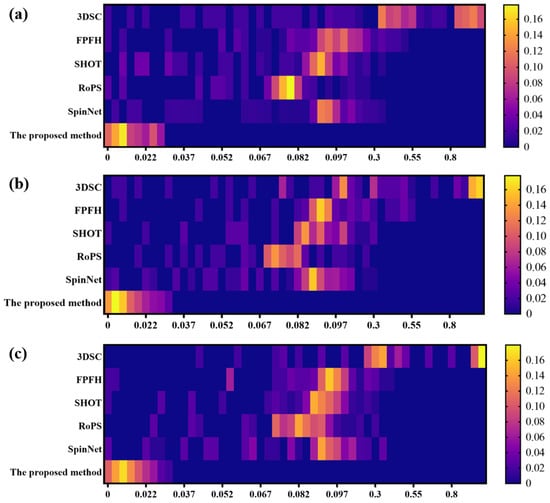 Figure 10 displays the heat maps of the distribution of residual errors for 3D homologous point matching across the XYZ directions, using different methods. The horizontal axis represents the magnitude of the matching residuals, while different colors indicate the percentage of matched points within that residual range relative to the total number of matches.