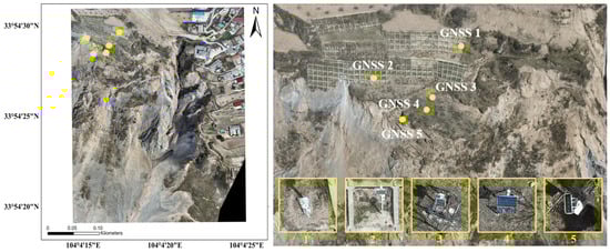 To validate the effectiveness of the proposed method, the deformation measurements of the proposed method were compared with the measurements from the GNSS monitoring points distributed in the multi-temporal Lijie north hill landslide area, which are regarded as ground truth. The locations of these GNSS sites are shown in Figure 11.