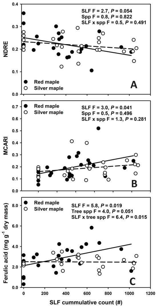 3.3. Relationships of Spectral Indexes and Foliar Chemistry with SLF Cumulative Densities