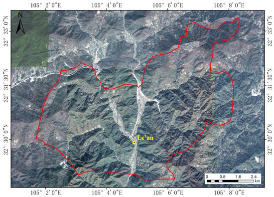 Le’an Town is located in Guangyuan City, Sichuan Province, China, at approximately 32.4355° North latitude and 105.8434° East longitude (Figure 2). It covers an area of approximately 44.6 square kilometers and features a terrain that slopes from northwest to southeast, with predominantly mid-mountain topography. It also encompasses various landforms including low- to mid-mountain areas, hills, terraces, valleys, and small plains. The highest elevation within the town is 3837 m above sea level, while the lowest elevation is 491 m. Situated at the southern foothills of the Qinling Mountains, Le’an Town falls within a transitional zone of the north–south climate. As a result, it exhibits characteristics of a subtropical humid monsoon climate, with an average annual temperature of around 13.7 °C and an average annual precipitation of approximately 1027 mm. The climate is characterized by a relatively delayed spring, a short summer, a cool autumn, and a long winter. Furthermore, the three-dimensional climate variation is significant, meaning that climatic conditions vary with altitude, with different elevations experiencing distinct climatic conditions.