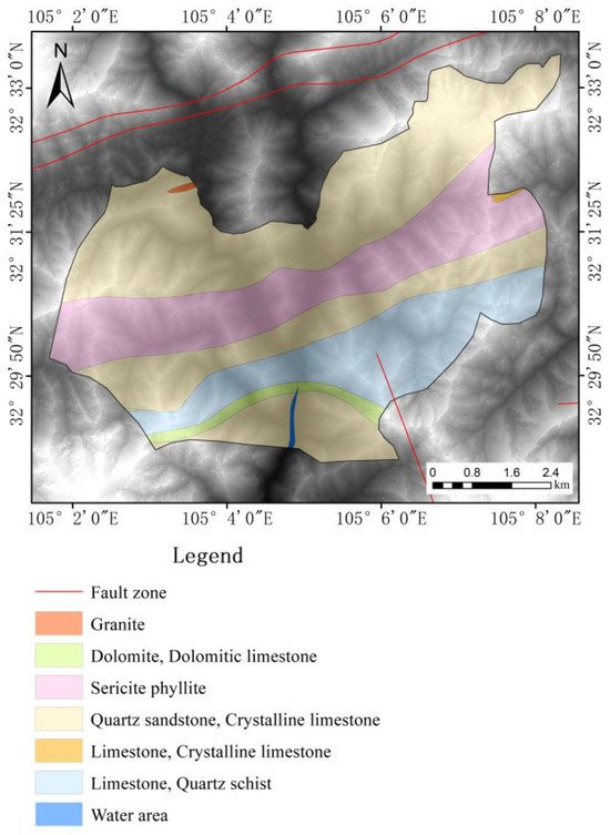 The regional tectonic activity in Le’an Town has resulted in the formation of unique geological landscapes and geological relics. Situated within the transitional zone between the Songpan-Ganzi orogenic belt and the Yangtze Craton, Le’an Town features complex geological structures and diverse landforms. Its geological history has undergone multiple evolutionary stages, including the formation of the Yangtze Platform basement during the Middle and Late Proterozoic, the evolution of passive continental margins from the Cambrian to the Middle Triassic, the transformation from basin to mountain and the subsequent formation of foreland basins during the Late Triassic, the development of foreland basins from the Late Triassic to the end of the Jurassic, and the filling and disappearance of foreland basins from the Late Jurassic to the Tertiary. The geological strata in the Le’an Town area mainly range from the Late Proterozoic to the Early Paleozoic, encompassing formations such as the Cambrian, Ordovician, Silurian, and Carboniferous. Several geological hazard points, such as landslides and collapses, are often developed along fault zones. The presence of these hazard points indicates the active tectonic activity in the region, where the lithology of the strata may exhibit heterogeneity and contain weak interlayers (Figure 3). Concurrently, ongoing regional engineering geological studies have identified predominant lithologies including purple thin-layered mudstone, calcareous mudstone, and shale, with the presence of weak mudstone interlayers, the development of minor-to-moderate folds, intense structural deformation, fault traces, and widespread joint fissures, indicating relatively poor rock strength.