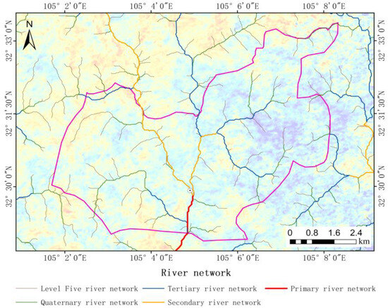 Based on the extraction of the flow-accumulation map of the study area, the river network was extracted through threshold segmentation, and then the river network was connected and classified (Figure 6).