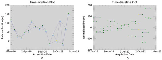 where , represent the deformation phase, topographic phase, satellite orbit error, atmospheric delay phase, and noise, respectively. To ensure the quality of interferograms in data processing, considering both temporal and spatial baselines, 11 July 2022 images were selected as the master images. The main image selected for this study is dated 11 July 2022. Concurrently generated with the coherence map (Figure 9a), a baseline map (Figure 9b) displays the temporal- and spatial-baseline lengths between image pairs. The baseline map serves as a crucial criterion for assessing the suitability of image pairs for interferometric processing, where shorter baselines contribute to obtaining high-quality interferograms.