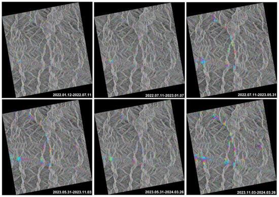 This study performs interferometric processing on the selected images. During the registration process, DEM data are used as geographical references to enhance registration accuracy. The registered image pairs undergo differential interferometry processing to generate interferogram maps (Figure 10).