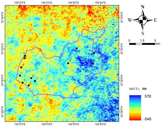 Through processing multi-temporal SAR (Synthetic-Aperture Radar) imagery and utilizing the principles of interferometry, surface deformation information was extracted. By selecting image pairs with small spatial and temporal baselines for interferometric processing, the impact of atmospheric delay and terrain errors was effectively reduced, thereby improving the accuracy of deformation monitoring. After steps including phase unwrapping, filtering, and deformation modeling, 12 landslide deformation areas (a-l) within the study area were successfully identified (Figure 14). Each area exhibits different deformation trends and rates, reflecting the complexity of internal stress states, geological structures, hydrological conditions, and external triggering factors (such as rainfall, earthquakes, etc.) within the landslide body. Some areas show significant surface subsidence, while others exhibit surface uplift. This coexistence of subsidence and uplift further demonstrates the diversity and dynamic nature of landslide activities.