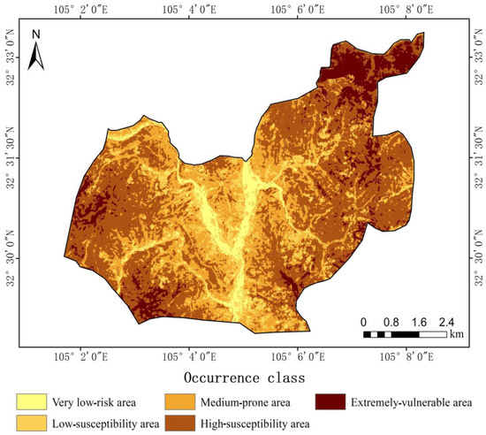 After conducting a thorough analysis of the factors influencing land-use type changes and employing precise SBAS (Small Baseline Subset) monitoring imagery data, considering various factors such as terrain, topography, soil conditions, and human activities, we used the Natural Breaks method to delineate landslide-prone areas. The range of values for each classification criterion was determined based on natural breakpoints (i.e., significant change points) in landslide risk-assessment data. Consequently, we obtained five classification criteria (extremely-vulnerable, high-susceptibility, medium-prone, low- susceptibility, very-low risk) and their corresponding range of values (Figure 17). The research results indicate that the northeast area and eastern area have become concentrated in the high-susceptibility zone. A notable characteristic of these areas is significant changes in land-use types, where intense land-use changes disrupt the original ecological balance and weaken the stability of geological structures. Consequently, these areas face higher landslide risks. In contrast, the middle region emerges as the primary distribution area for the low-susceptibility zone. These areas have relatively homogeneous land types and stable geological structures, resulting in a lower probability of landslide occurrence. This result not only highlights a high degree of correspondence between predictive results and actual landslide distribution, but also validates the scientific rigor and accuracy of the research methodology.