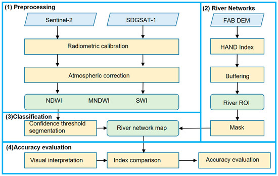 This study presents a comparison among three indices on SDGSAT-1, regarding their ability for river water extraction (Figure 2). The methodology consists of four steps: (1) preprocessing of remote sensing image from SDGSAT-1 and Sentinel-2; (2) extracting river networks; (3) applying determined thresholds for accurately classifying water bodies; and (4) assessing the accuracy of water extraction.