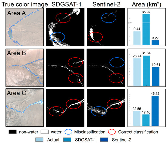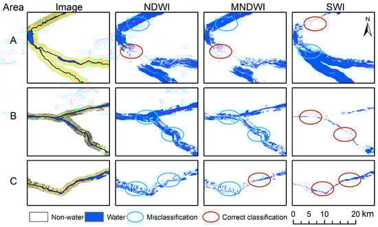 The performance comparison of three water indices on SDGSAT-1 imagery covering Areas A-C has been conducted (Figure 3), with the calculated optimal thresholds (Table 3) and extracted areas summarized (Table 4). Correctly classified areas are highlighted in red circles, while misclassified areas are indicated by blue markings. The analysis reveals that SDGSAT-1 imagery can effectively extract river bodies. In Area A, the narrow river water bodies, including the prominent Dang River Reservoir, are captured. However, despite the high resolution and rich spectral information of SDGSAT-1 imagery, some non-river pixels were erroneously classified as river pixels. This area of NDWI reached an excessively high 67.78 km2, which could be attributed to the spectral similarity between these regions and rivers. The NDWI and MNDWI exhibit good river segmentation in the middle region, while the SWI performs well in the north. In Area B, where the water bodies are ice-covered and surrounded by complex terrain, the extraction task becomes significantly challenging. Nevertheless, the SWI exhibits remarkable performance in this region, demonstrating clear edge contours and detailing river expression, effectively segmenting the target. The extracted water area measures 31.64 km2, only slightly exceeding the actual area by 2.9 km2. The NDWI and MNDWI tend to misclassify mountain pixels as river pixels, with the NDWI exhibiting particularly low discrimination between the two, resulting in an extracted area that is four times larger than the actual water body area. Area C, characterized by relatively open water bodies with fragmented sections, poses challenges for extraction. Despite these difficulties, the SWI maintains superior segmentation capabilities, with clear river edges and details. For instance, while the NDWI and MNDWI demonstrate effective extraction in certain areas, their limitations in handling complex water conditions are also evident.
