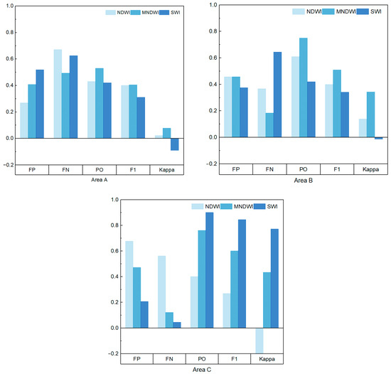 The Sentinel-2 satellite, armed with high-performance hyperspectral capabilities, stands as a globally accessible platform, offering a broadened spectral range that significantly enhances spectral discrimination. The inherent spectral attributes of surface features serve as robust markers across diverse land cover types, pivotal for large-scale land cover identification. Extracting water body information across vast spatial scales often necessitates sophisticated background modeling. Consequently, the Sentinel-2 satellite unequivocally excels in extracting water body information due to its spectral capabilities [25]. However, in Area A, Sentinel-2 images reveal a notable degree of omission, with the extracted water area being significantly smaller than the actual water area (Table 5). Comparative analysis reveals minimal differences in extraction performance among three water indices using Sentinel-2 images [26]. Accuracy assessments pinpoint the NDWI as the optimal index for Sentinel-2 imagery, with overall accuracies of 0.77, 0.74, and 0.91, and Kappa coefficients of 0.203, 0.244, and 0.461 across three areas, respectively. The extraction accuracy of the NDWI and MNDWI surpasses that of the SWI, with kappa in Area A being only 0.105. It is notable that in Sentinel-2’s spectral features, the first and third rankings are also occupied by the short-wave infrared bands (Band 11 and Band 12). When it comes to the visual interpretation of water bodies, the near-infrared (NIR) band is typically preferred due to its strong absorption by water and its pronounced reflection by terrestrial vegetation and dry soil. This highlights the substantial impact that the distinctive bands of these two satellites have on the classification results [22].