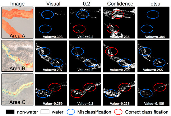 The various threshold selection methods have different impacts on the hydrological analysis, with studies demonstrating that regions with varying river complexities may benefit from specific threshold selection methods, enhancing the understanding and management of river systems [23]. This study, based on SDGSAT-1 satellite imagery, comparatively analyzed four thresholding methods: the visual interpretation method (visual), the Otsu method (Otsu), the single threshold method (0.200), and the confidence thresholding method (Confidence). Both visual processing and statistical analysis are employed to present local results of the mentioned methods across three distinct areas of the SDGSAT-1 image (Figure 5), with the distribution characteristics of results (Figure 6). After a thorough analysis of the application effects of threshold segmentation methods in different regions of the SDGSAT-1 imagery, it has been found that their performances are significantly influenced by a series of intricate and interconnected geographical, environmental, and image characteristics. In Area A, similar spectral characteristics between water and other surfaces hinder precise threshold setting, leading to suboptimal performance across various methods. The confidence thresholding method somewhat enhances accuracy by integrating feature data but still struggles to fully capture water bodies due to environmental complexity. In Area B, mountain shadows significantly disrupt threshold segmentation, causing the misidentification of water bodies. Despite this, the visual interpretation method and confidence thresholding method partially mitigate shadow effects by leveraging image features and knowledge, yielding more precise water edge detection, though some disturbances may persist. In Area C, the single threshold method and confidence thresholding method exhibit relatively superior performance, extracting water body information more distinctly and with more significant results. This indicates that the application effects of threshold segmentation methods vary across regions [24]. Tailoring methods to specific scenarios and enhancing them with additional techniques like manual interpretation and the confidence thresholding method is crucial.