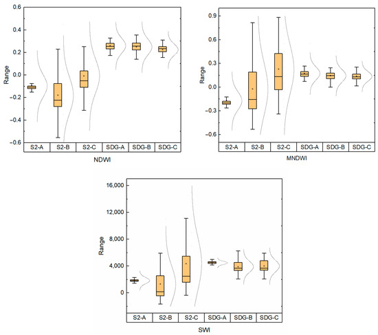Boxplot of water index value distribution in the three test areas (S2-A represents Area A on Sentinel-2 image, SDG-A represents Area A on SDGSAT-1 image, and so forth).