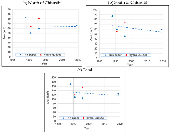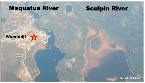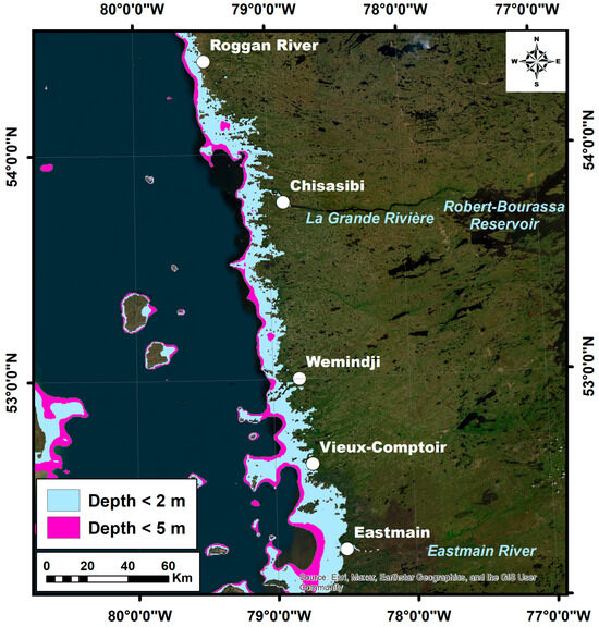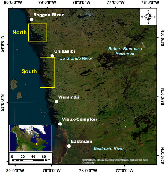 The study area is located on the eastern coastline of James Bay, in northwestern Quebec (Figure 1), and extends roughly from 52°05′N to 54°24′N in latitude. James Bay is the southern extension of the larger Hudson Bay, the largest estuary in the world [69], and represents the most southerly extension of Arctic waters [70]. The coastal land, also known as Eeyou Istchee, is the traditional territory of the Eeyou or Cree Nations and encompasses a vast area covering a diverse landscape, including boreal forests, tundra, wetlands, rivers, and lakes. Three Cree communities (Chisasibi, Wemindji, and Eastmain) exist in the coastal territory in the study area (Figure 1). The study area has numerous rivers that flow into James Bay and drain an area of approximately 415,000 km2.