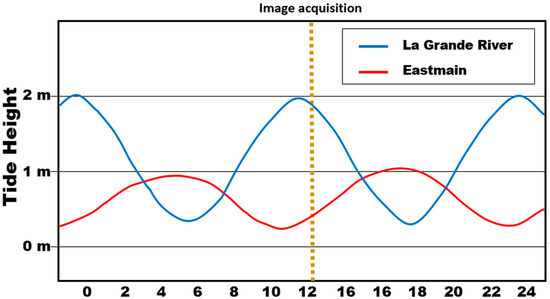 Due to the limited amount of cloud- and ice-free scenes that covered the coastline’s full extent, the tidal level was not accounted for when selecting imagery. In addition, tidal data for this region are inconsistent, so accurate tidal measurements do not exist between 1986 and 1995, i.e., during the period of the eelgrass mapping already produced. Even if it is possible to estimate tide heights from mathematical formulas, the time for the extreme water heights does not occur simultaneously and with the same height amplitude for the entire coast of James Bay. For example, using the estimate values from the Canadian Hydrographic Service [76], it was possible to draw a plot showing the tide height variation during the day related to the Lowest Normal Tide (LNT) computed for two stations located along the eastern coast of James Bay on 16 September 2019, which corresponds to the date of acquisition of the Landsat-8 image (Figure 2). This graph shows that, at the time of image acquisition, the tide height was quite different between the station in the northern part of James Bay (La Grande Rivière) compared to the station in the southern part of the bay (Eastmain). Indeed, there is a delay of approximately six hours in the arrival of a low tide between La Grande Rivière (station Loon Islands, ID 4680) and Eastmain (ID 4710), which are distant only by approximately 185 km. It is, therefore, impossible to determine a single tide height for the coast based only on the estimate of a single station, as was conducted in some previous studies [19,64].