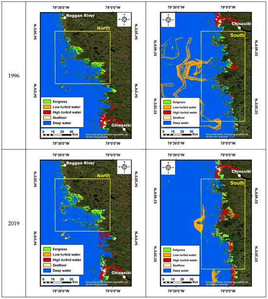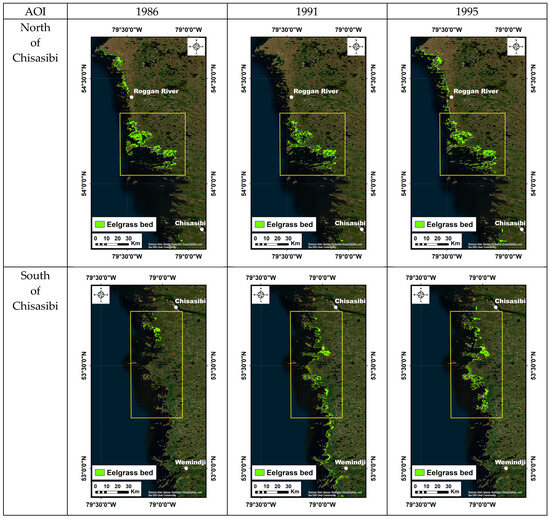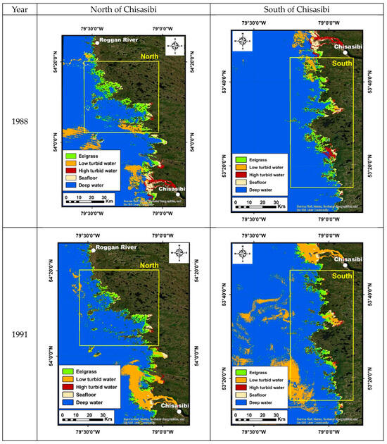 Our study considered only two areas of interest (AOIs) located along the coastline, where historical maps of the eelgrass distribution existed [30], which were used for validating the 1988, 1991, and 1996 classifications. The first zone is located north of Chisasibi and spans from 54°0′N to about 54°40′N, and the second one is south of Chisasibi and spans from 53°20′N to 53°45′N (Figure 1). For the 1988 case, the south Chisasibi zone covers the same extent as the other years, even though the Hydro-Québec map does not cover the entire area. Both areas of interest (AOIs) are located on each side of the La Grande River, the most important outlet of the hydroelectric complex established in this region [24]. One of the main consequences of the water discharge of La Grande River is a large plume of freshwater entering the bay from the mouth of the river [27]. The study area does not consider this river mouth and its immediate vicinity since no ground-truth data were collected for HQ in the mouth.