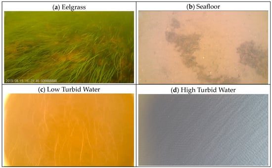 Underwater pictures of eelgrass, seafloor, and low turbid water were acquired by the CHCRP eelgrass field team [32], and one UAV RGB image was acquired over high turbid water along the eastern coast of James Bay.