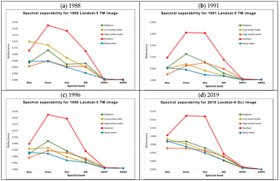 The overall classification accuracy of our classified Landsat imagery assessed by comparing with the training data subset ranged from 94.51% for the 1996 classification to 99.85% for the 2019 classification (Table 7), indicating exceptionally high classification accuracies for all the years. The quality of the training areas can first explain these good results. Indeed, all the training areas for the “Eelgrass” class have a good spectral separability between classes, with a J-M distance greater than 1.9 from the other classes, whatever the year (Table 6). The good spectral separability of eelgrass from other unvegetated classes is also shown in the graphical representation of the class spectral response for each Landsat band (Figure 7). For the “Eelgrass” class, the spectral signature is in agreement with the one obtained in other studies [130,131], with the highest reflectance in the green band [4,132,135]. Figure 7 also shows that the “High Turbid Water” class has the highest reflectance value in all the bands, such as a terrestrial class. In addition, the spectral separability between “Deep Water” and shallower “Eelgrass” is obvious in the case of clear water but not when the water is murky or coloured.